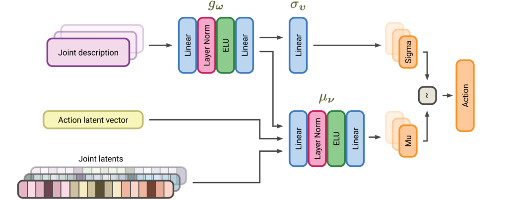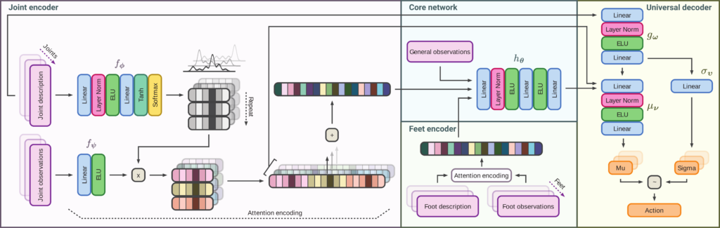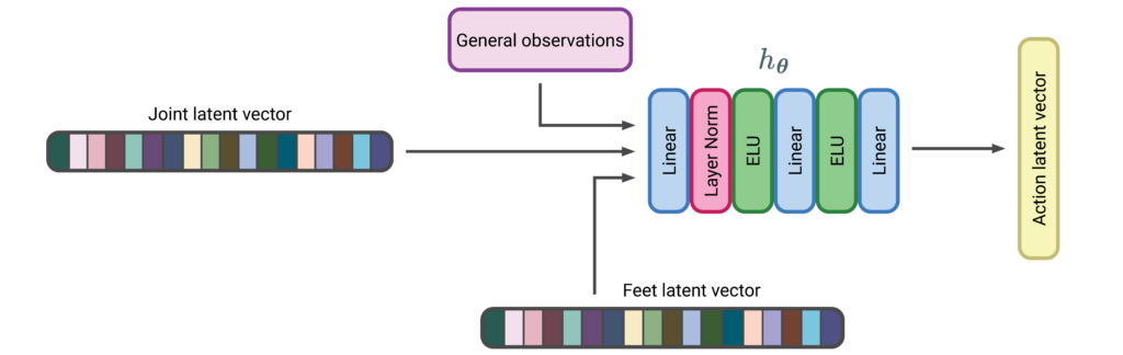 The resulting joint and feet latent vectors are concatenated with the general observations and passed to the policy’s core network. The output of the network is the action latent network that represents a meta locomotion action, and it’s ready to be decoded into an action for the specific embodiment!