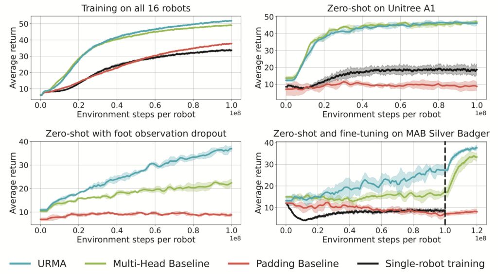 However, thanks to the wide variety of robots in the training set, the randomization of their properties, and the morphology-agnostic URMA architecture, the policy can also generalize to new robots never seen during the training process!