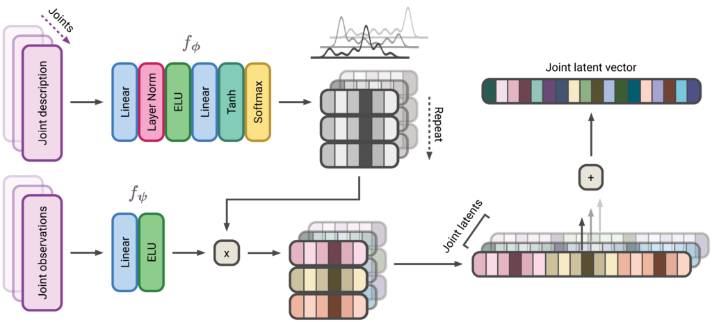 To handle observations of any morphology, URMA splits observations into robot-specific and general parts. Robot-specific observations are joint (and foot) observations. They have the same structure but vary in their number depending on the robot. We can only use fixed-length vectors in neural networks, so we need a mechanism that can take any joint observation and route it into a latent vector that holds the information of all joints. Similar joints from different robots should map to similar regions in the latent vector.